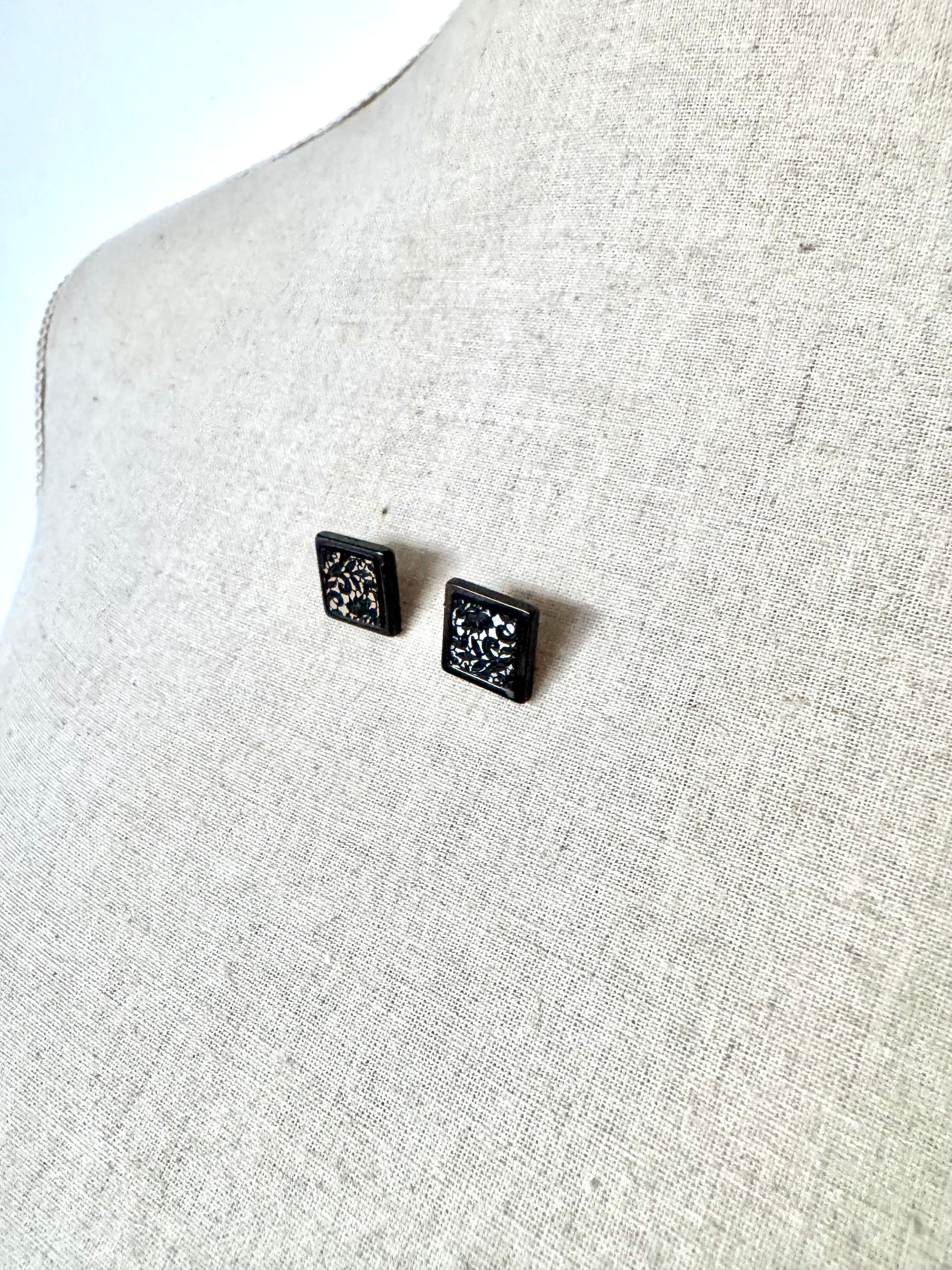 The lace pattern is laser etched onto silver acrylic and set into a black squares