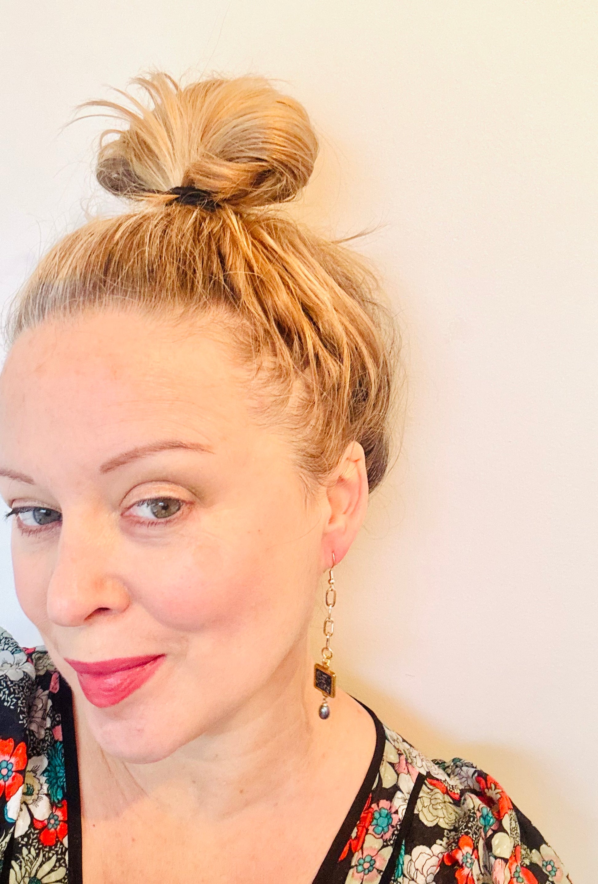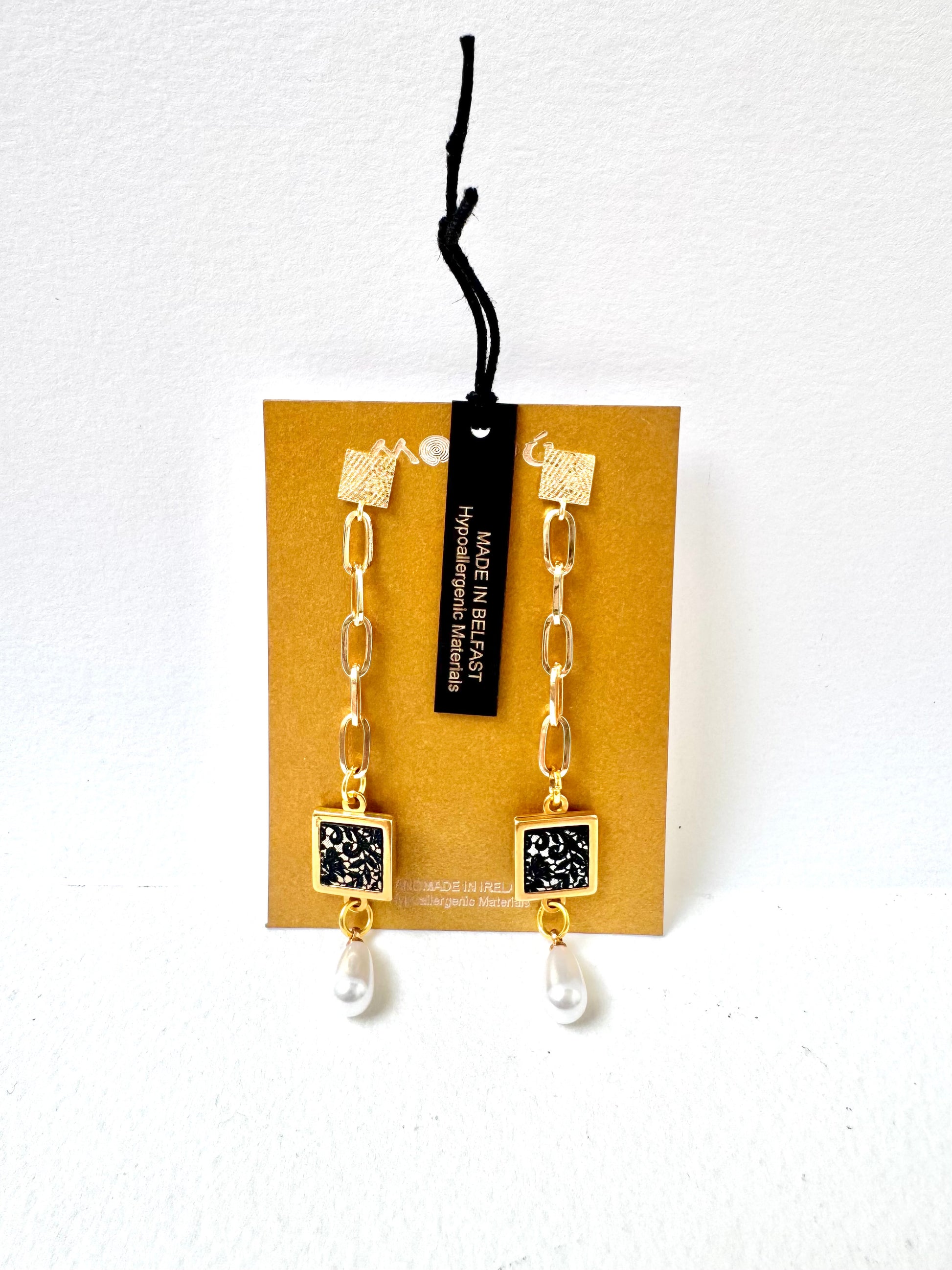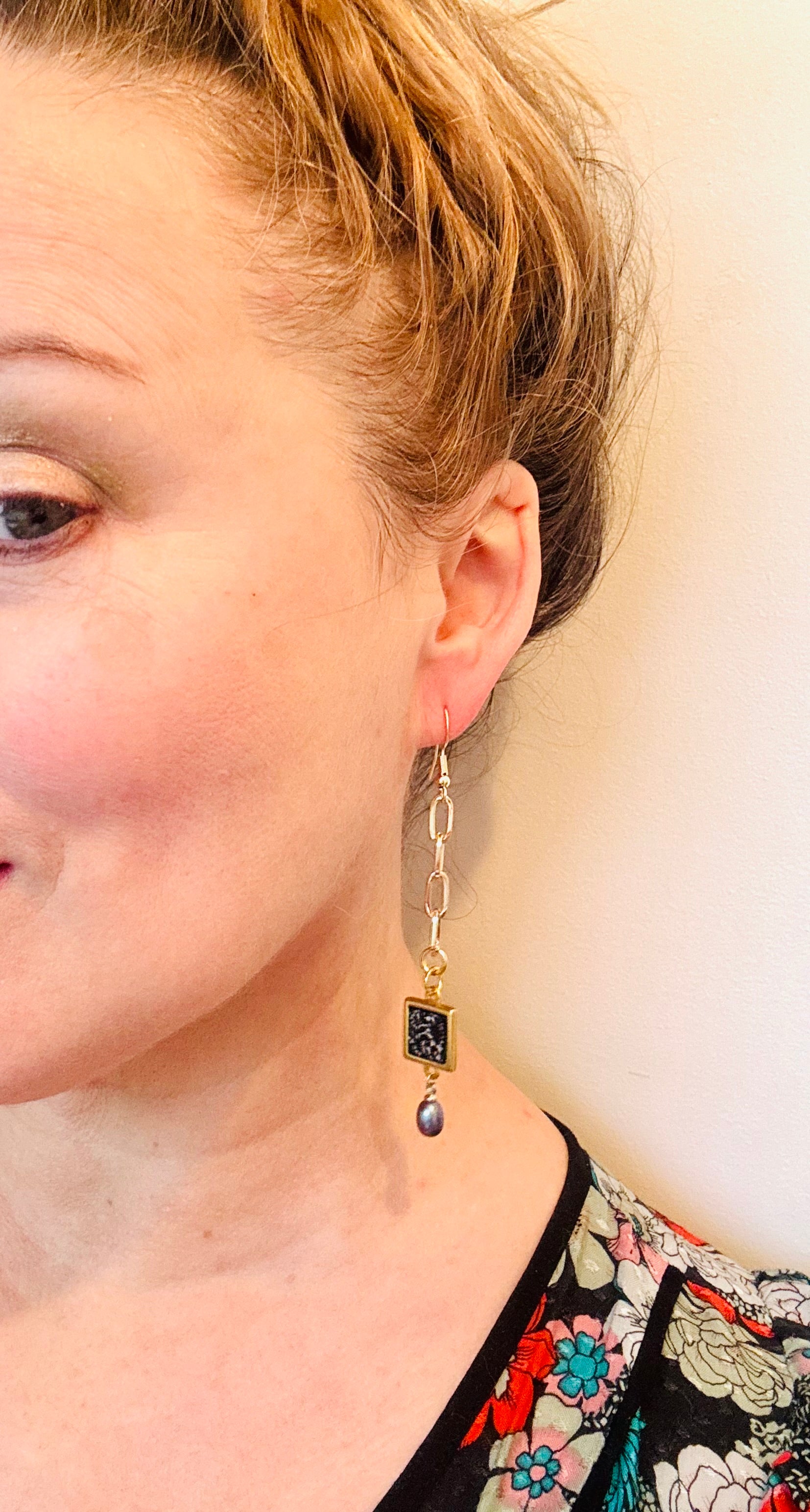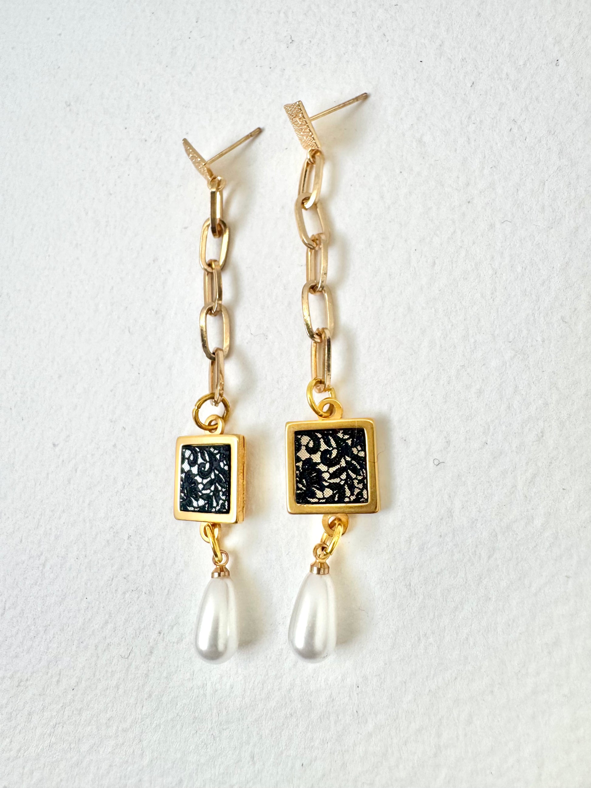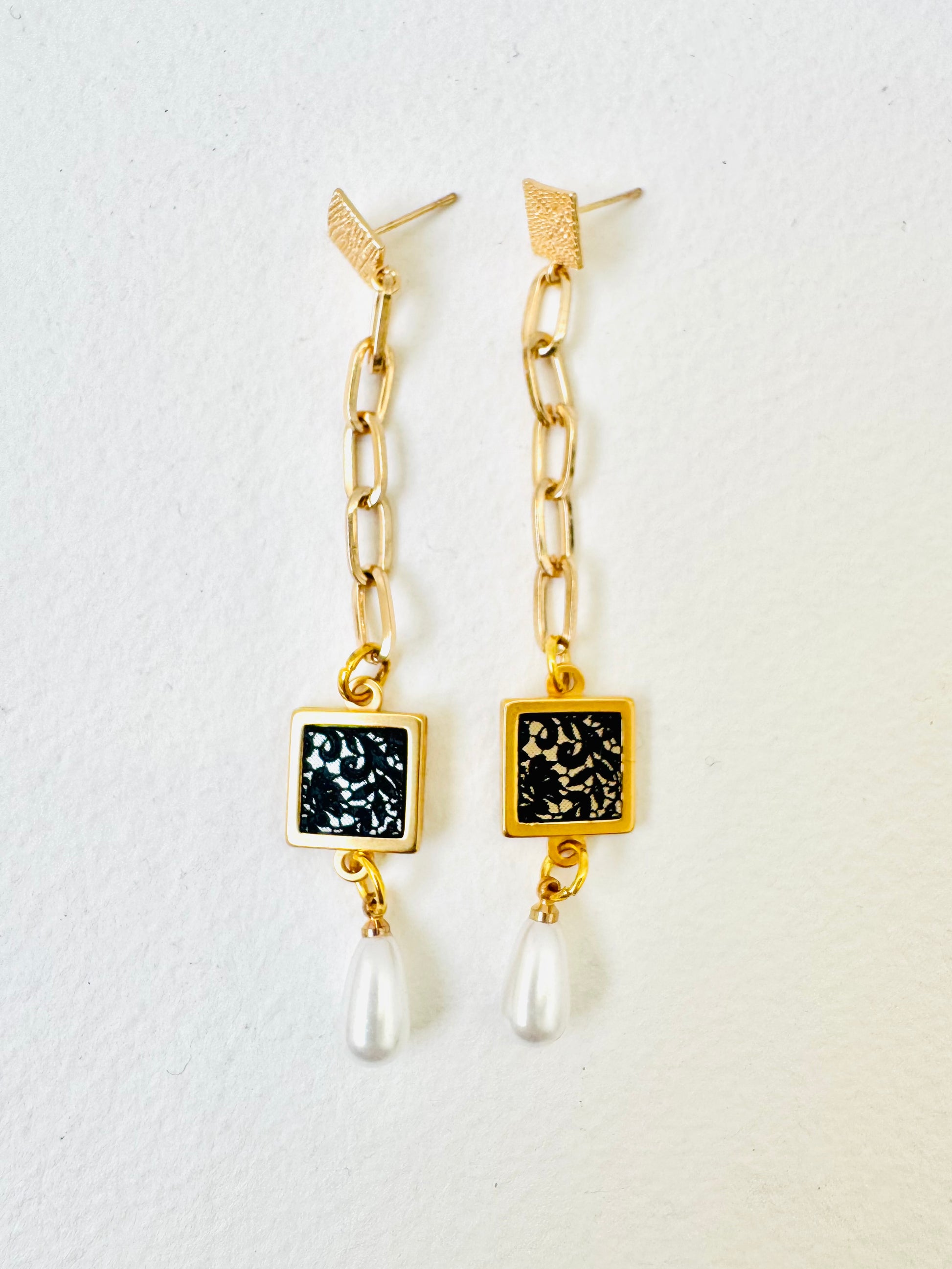 Gold plated rectangular setting with vintage lace pattern, etched onto silver acrylic, complimented with a Baroque bead and diamonte ear posts