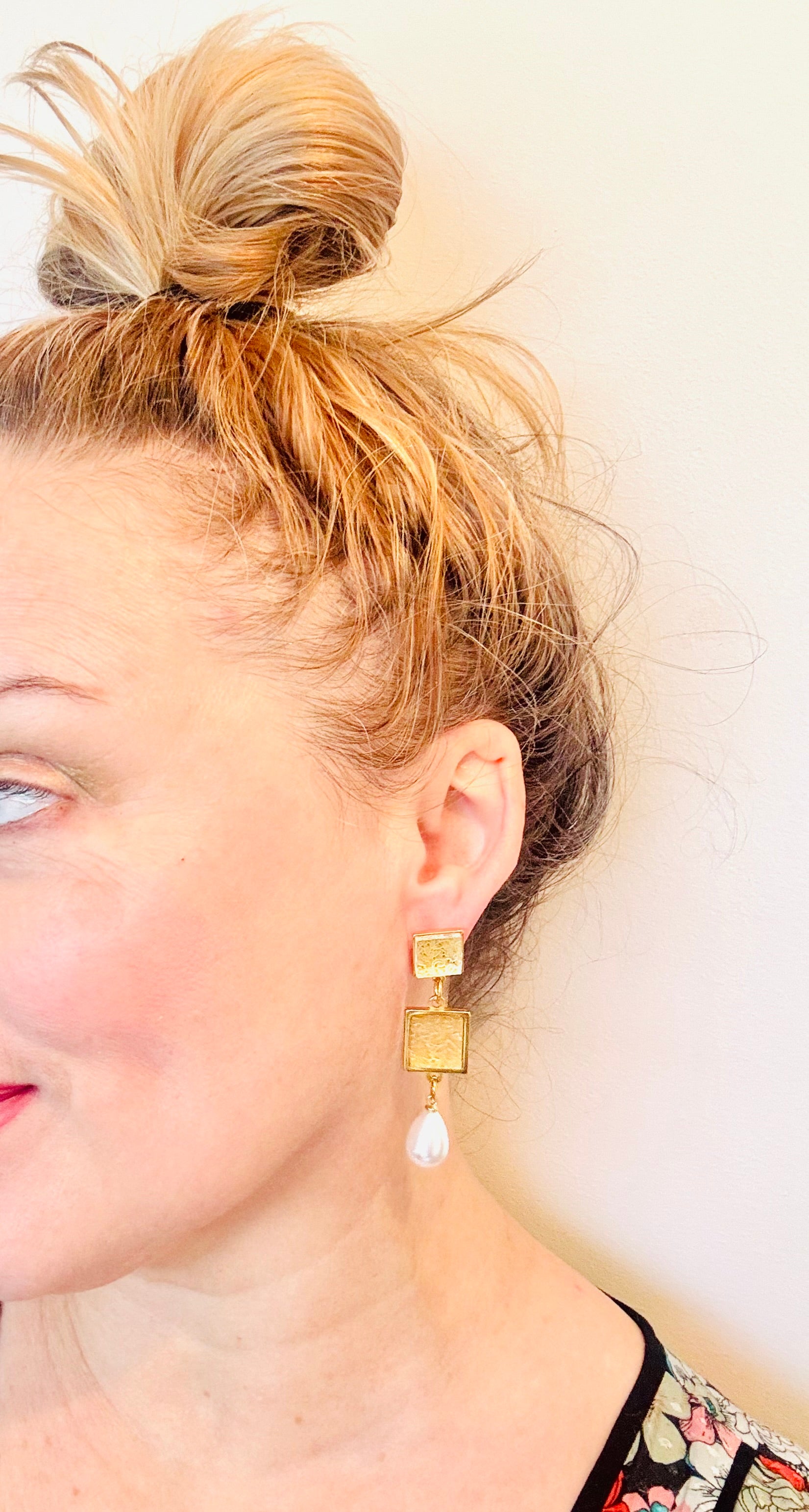These eye catching beauties are inspired by an antique Irish lace pattern and contemporary materials, made from gold plated brass and clear iridescent acrylics, large and mini square shapes, complimented with a large pearl bead, very unique in appearance they are perfect as a super stylish fashion accessory or beautiful gift!