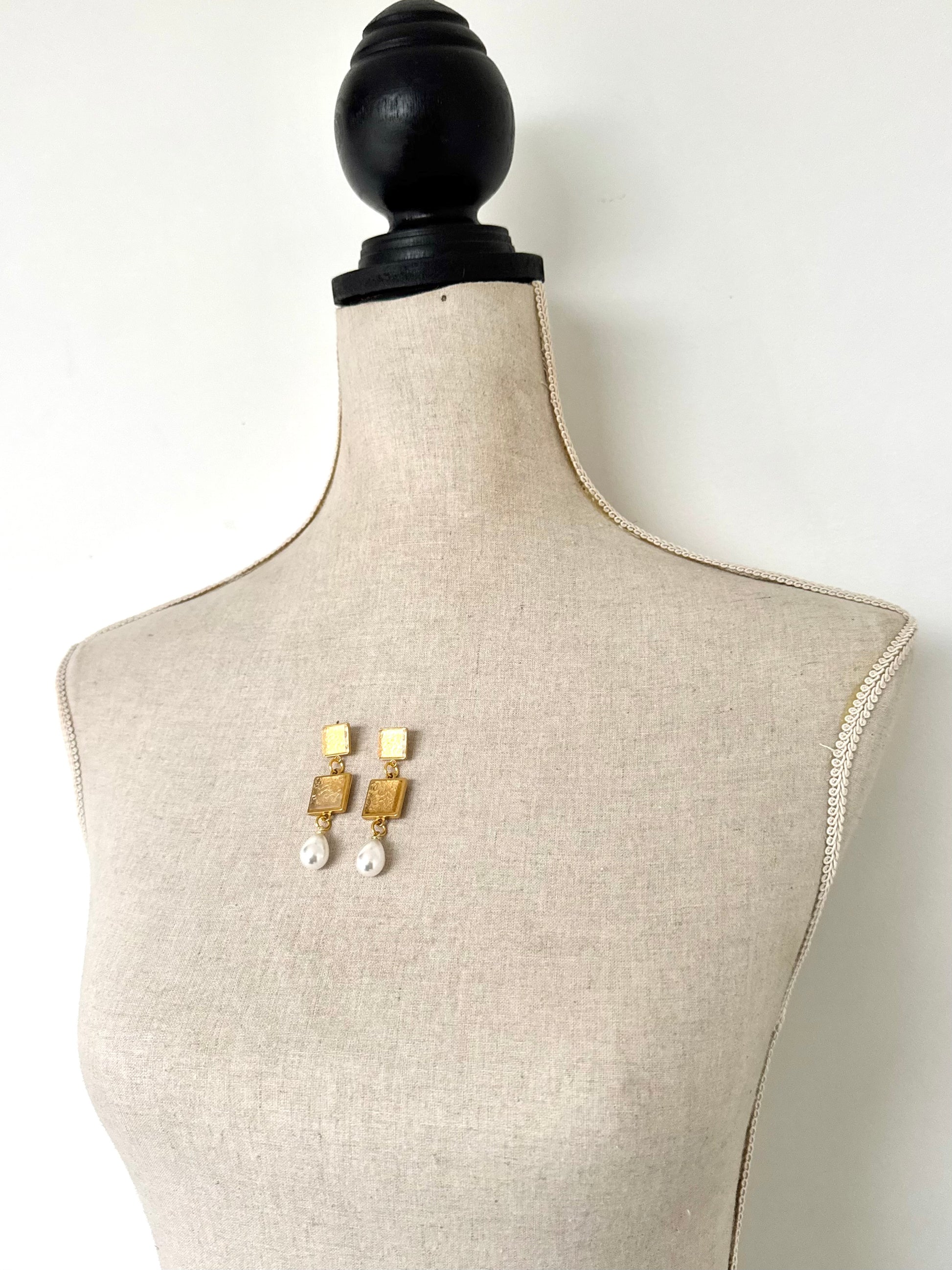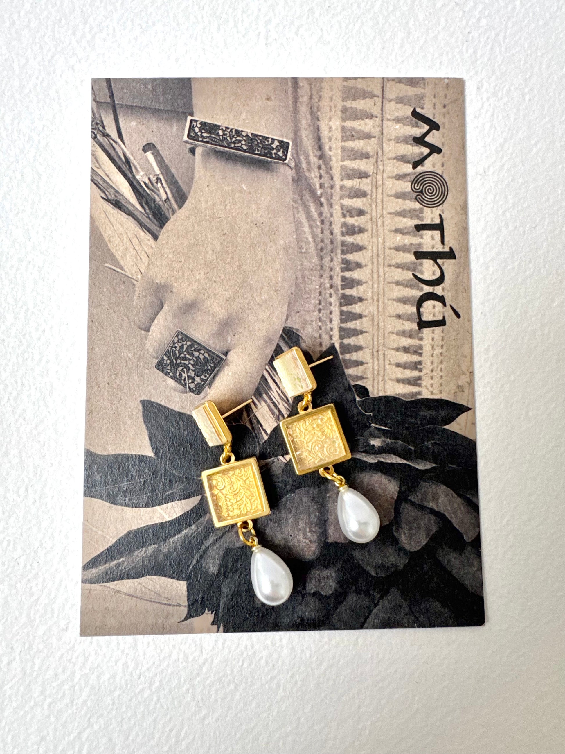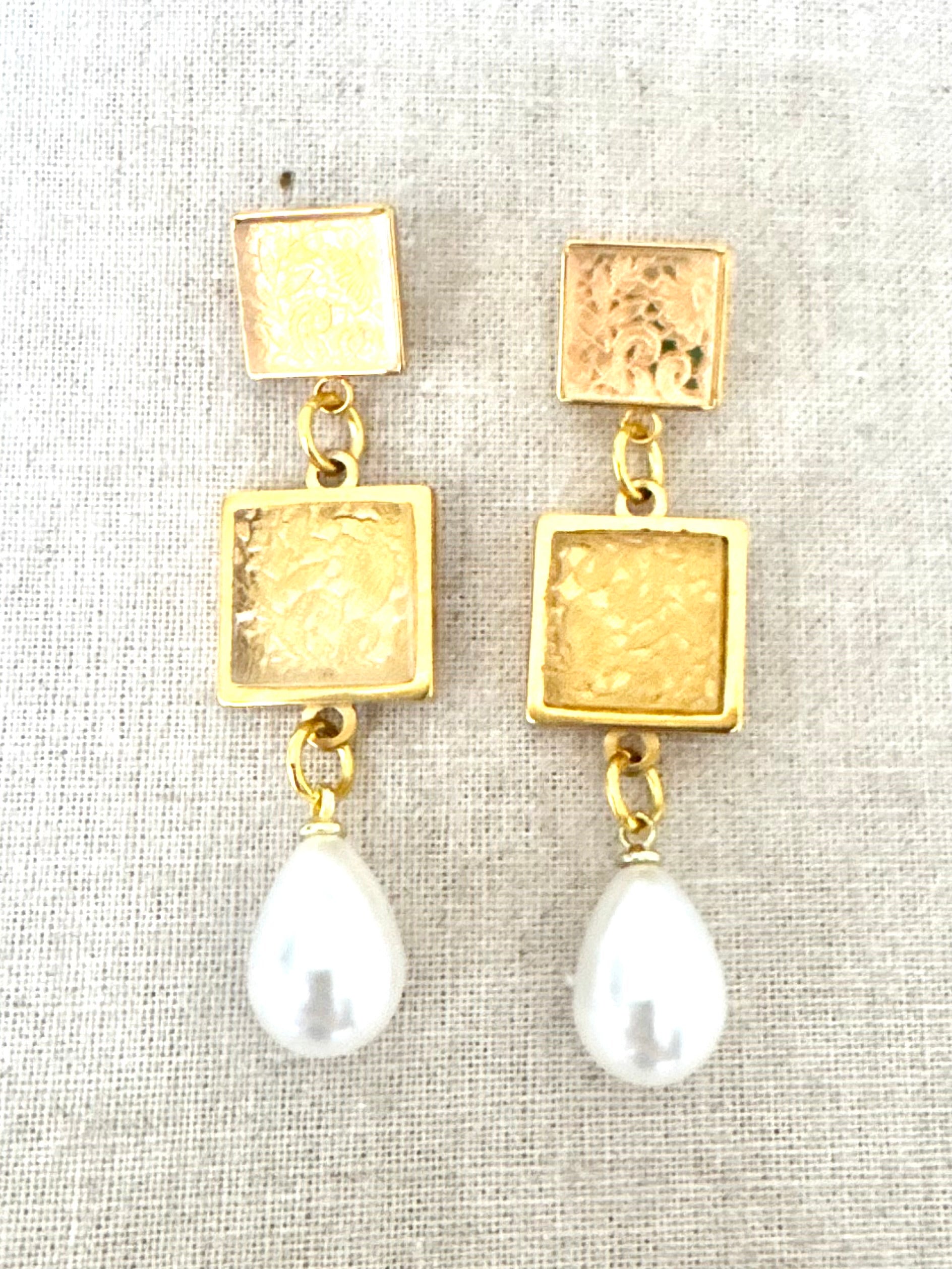 Vintage Lace Pattern etched onto clear acrylic, set into gold plated squares, complimented with a pearl bead.