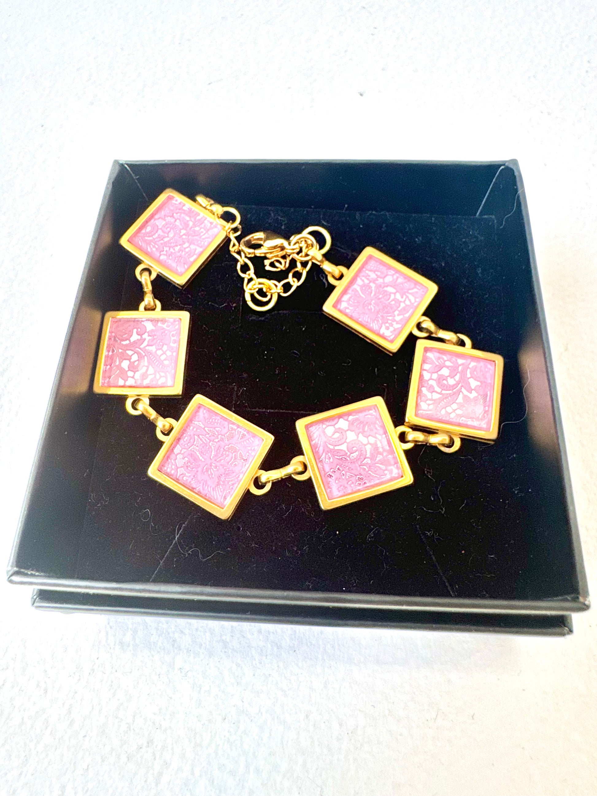 This eye catching beauty my love of vintage lace, antiques and contemporary materials, made from gold plated brass and pink mirror acrylics set into mini squares, very unique in appearance it is perfect as a super stylish fashion accessory or beautiful gift!