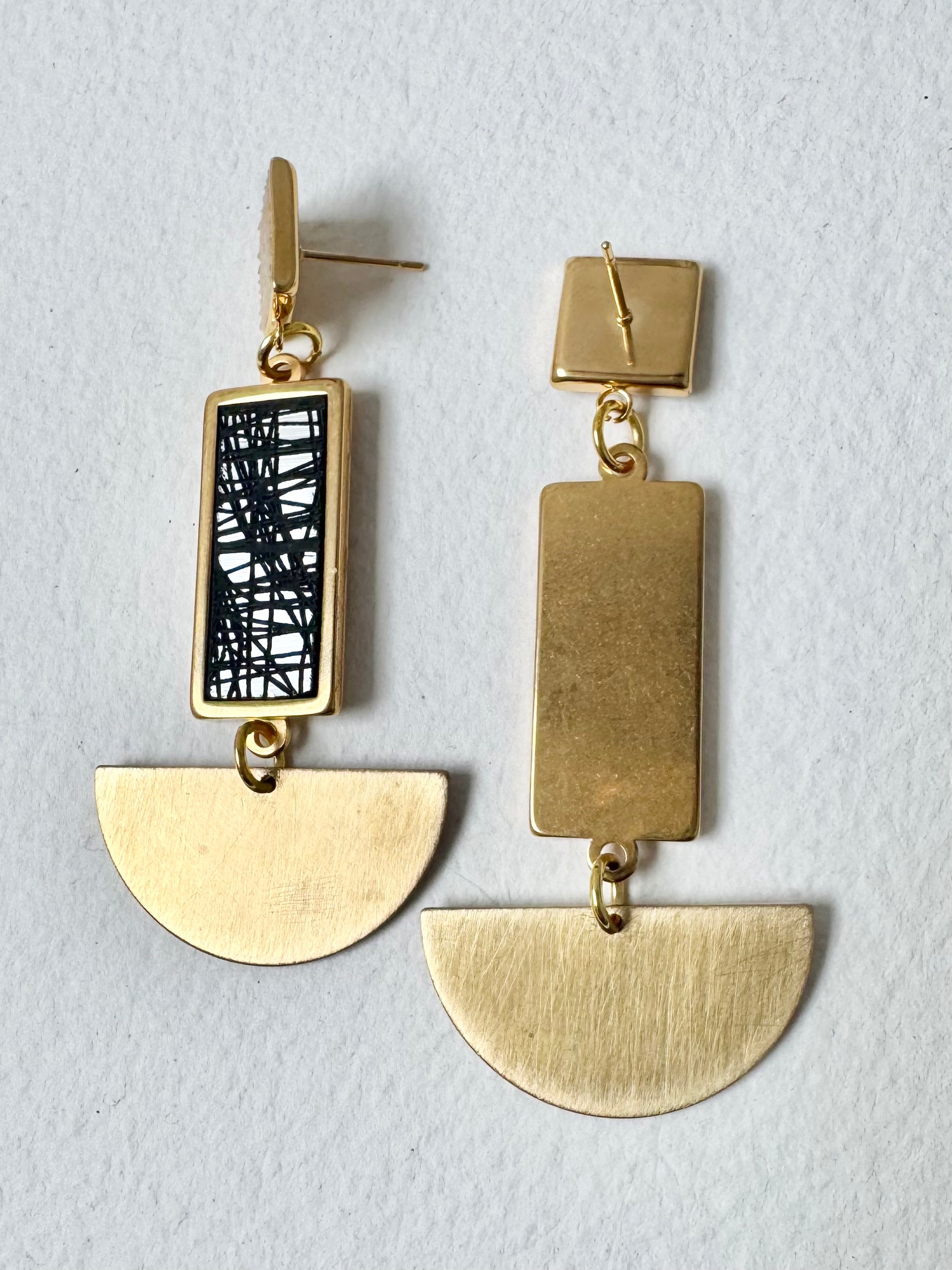 These eye catching beauties are inspired by an antique Irish lace pattern and contemporary materials, made from gold plated brass and clear iridescent acrylics, large and mini square shapes, complimented with a brass semi circle, very unique in appearance they are perfect as a super stylish fashion accessory or beautiful gift!