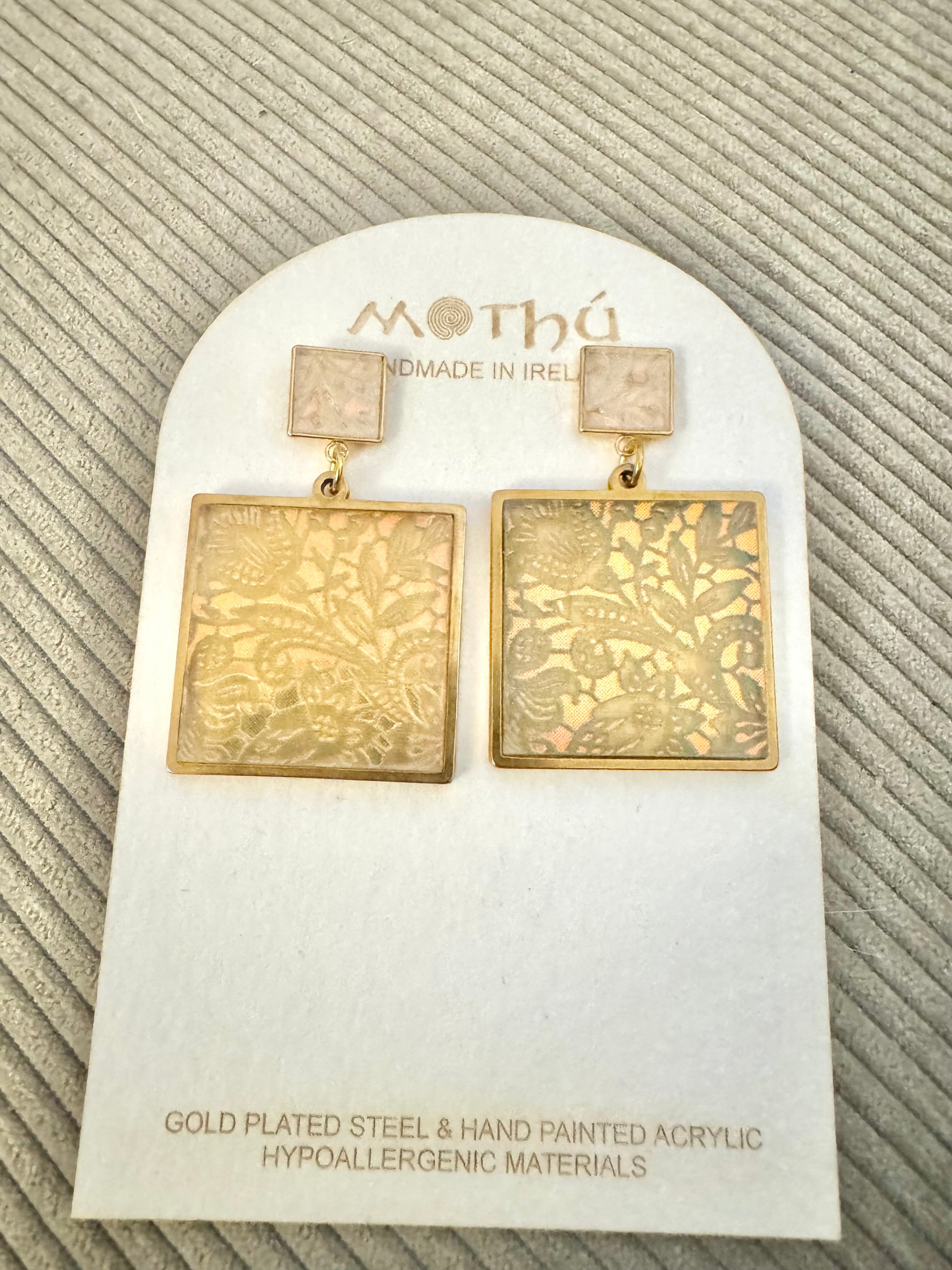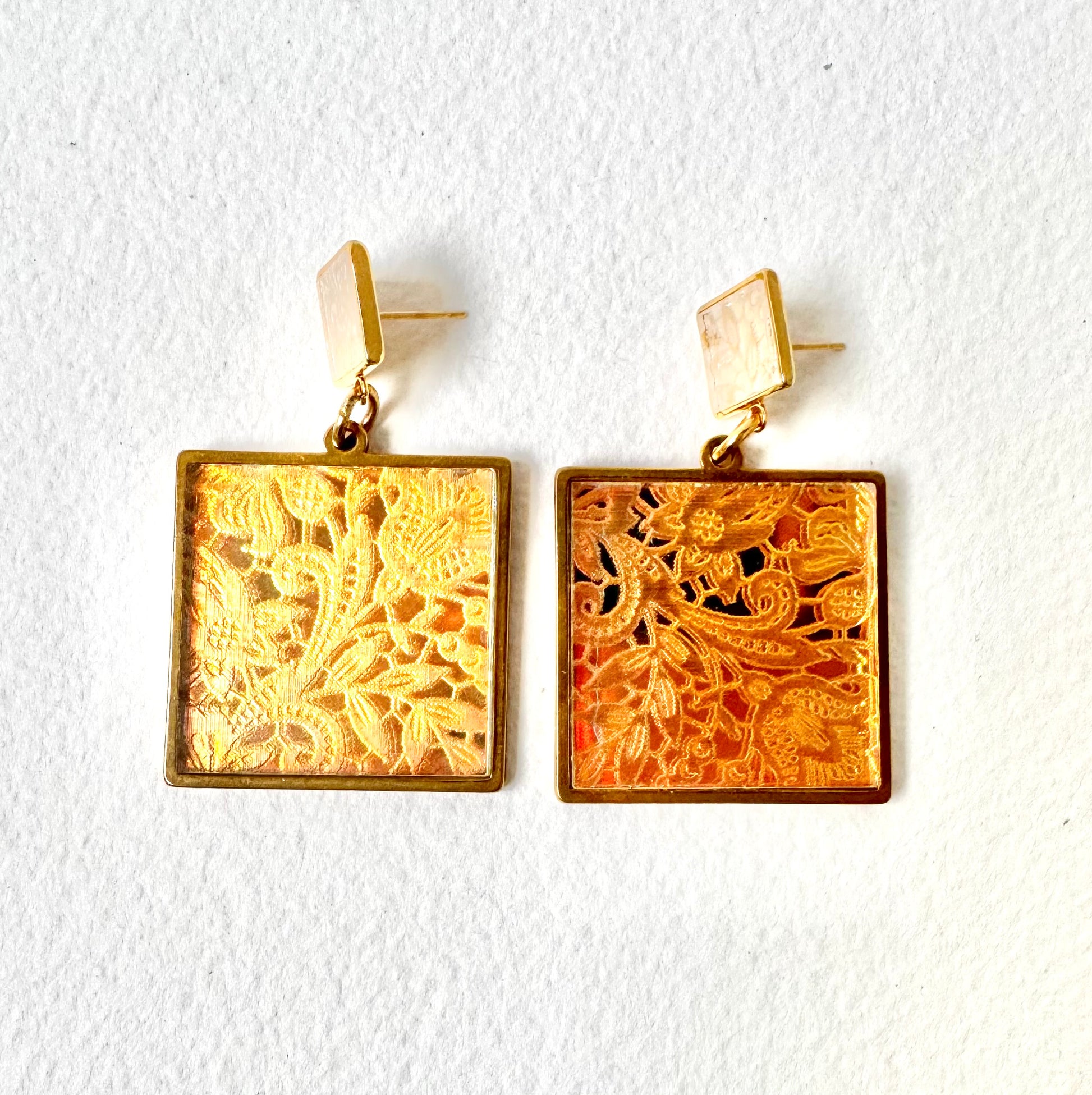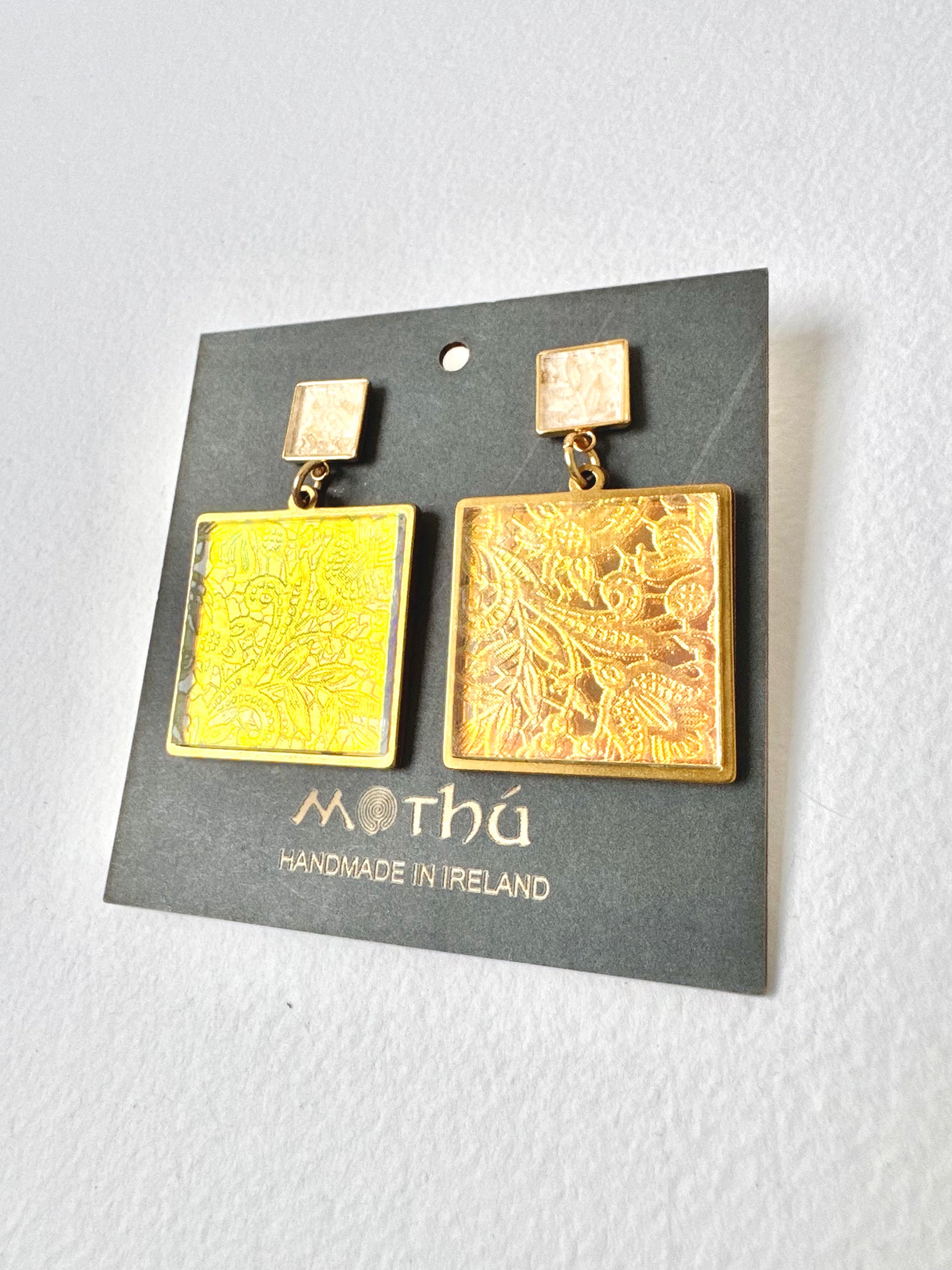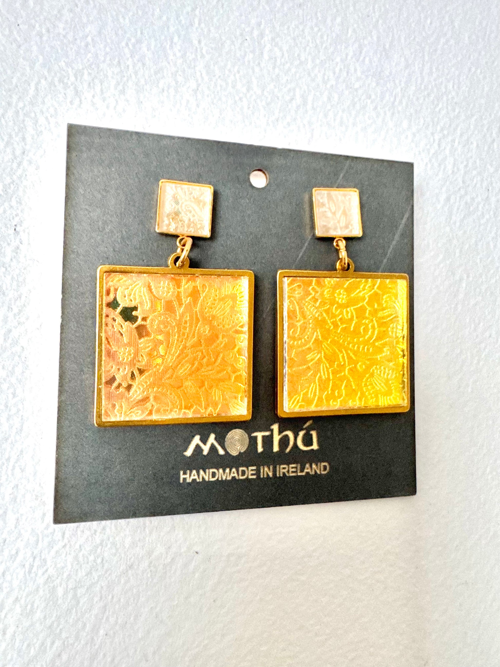 These eye catching beauties are inspired by an antique Irish lace pattern and contemporary materials, made from gold plated brass and clear iridescent acrylics, large and mini square shapes, very unique in appearance they are perfect as a super stylish fashion accessory or beautiful gift!